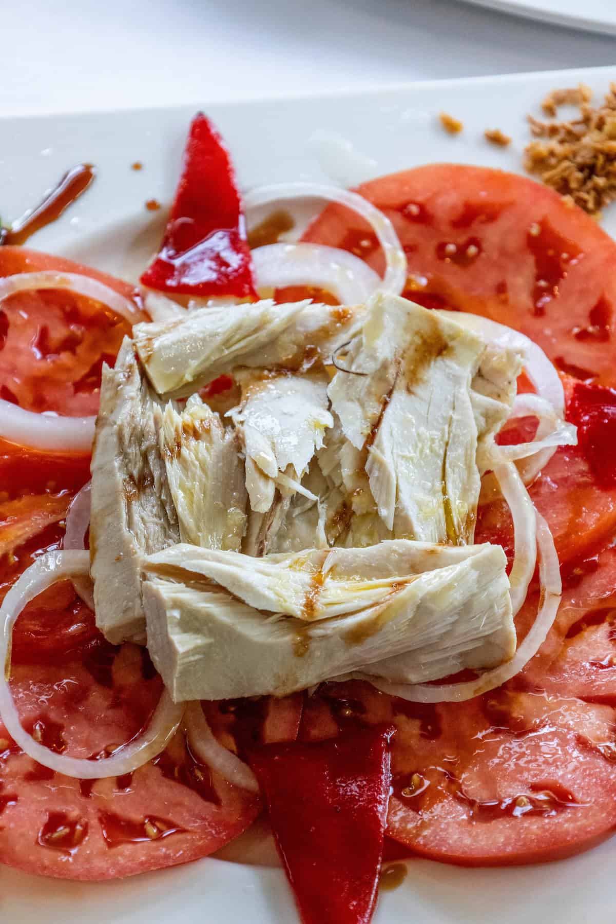 It’s all about the simple combination of ripe tomatoes, olive oil, and tuna — a classic pairing you’ll see served in Basque restaurants as a light starter or tapas-style plate.