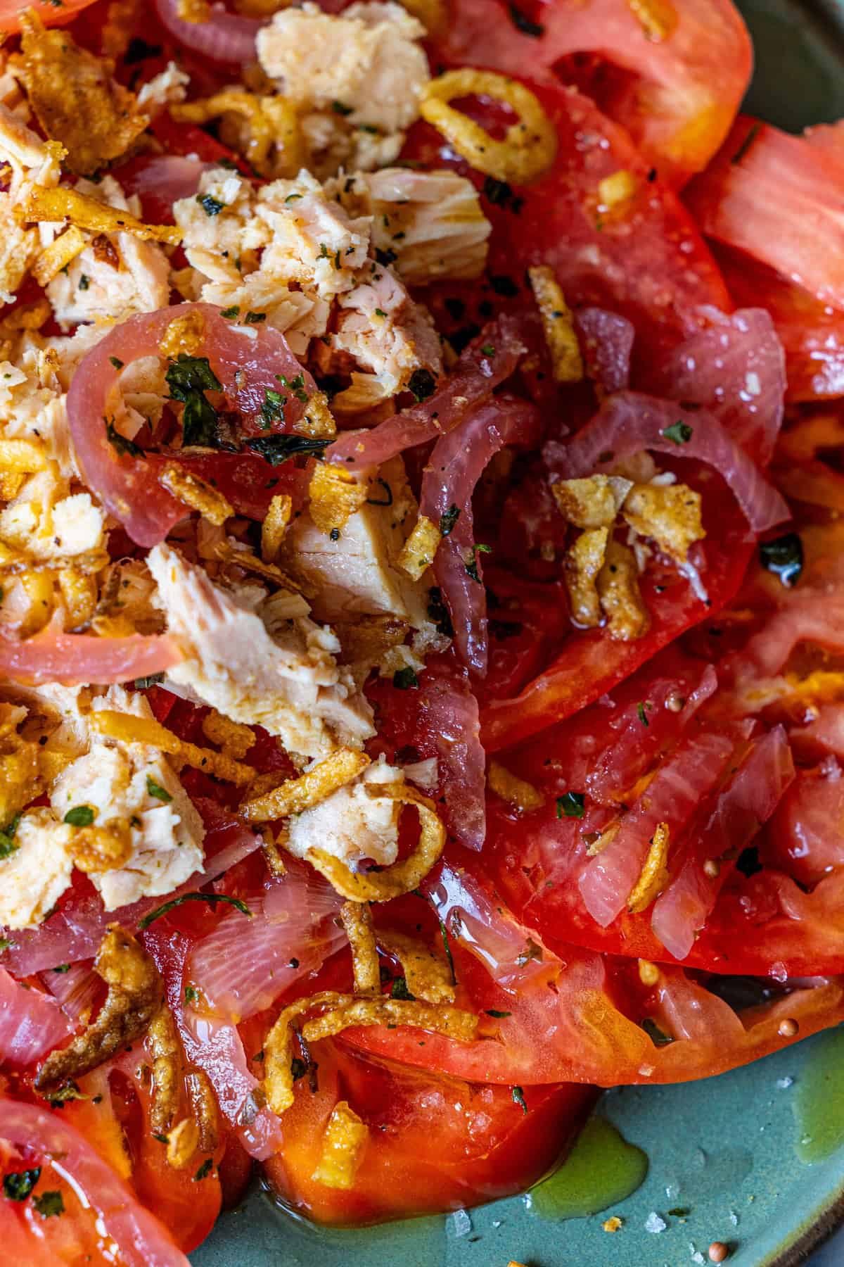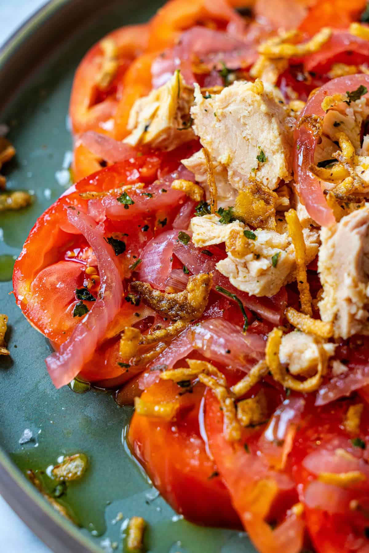 What makes this version extra crave-able is the contrast of juicy tomatoes and rich tuna with thin-sliced red onion and a handful of crunchy fried onions on top. It’s fresh, salty, bright, and satisfying in the best way. I like to serve it with crusty bread for an easy lunch that feels restaurant-worthy with almost no work.