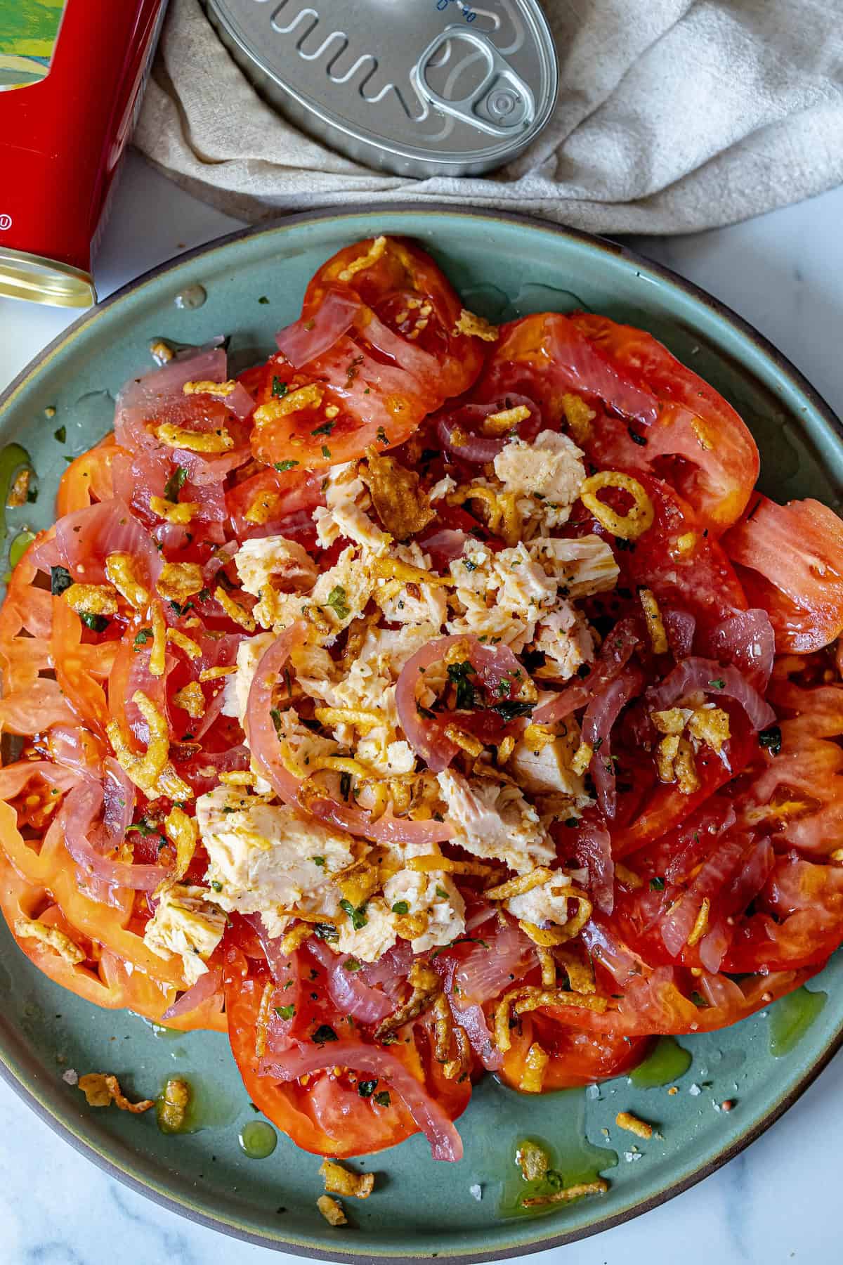 This Spanish tuna and tomato salad is a Basque-inspired favorite made with ripe tomatoes, olive oil, canned tuna, red onion, and crunchy fried onions. Fresh, savory, and ready in minutes, it’s perfect as a light lunch, tapas-style starter, or easy side with crusty bread.